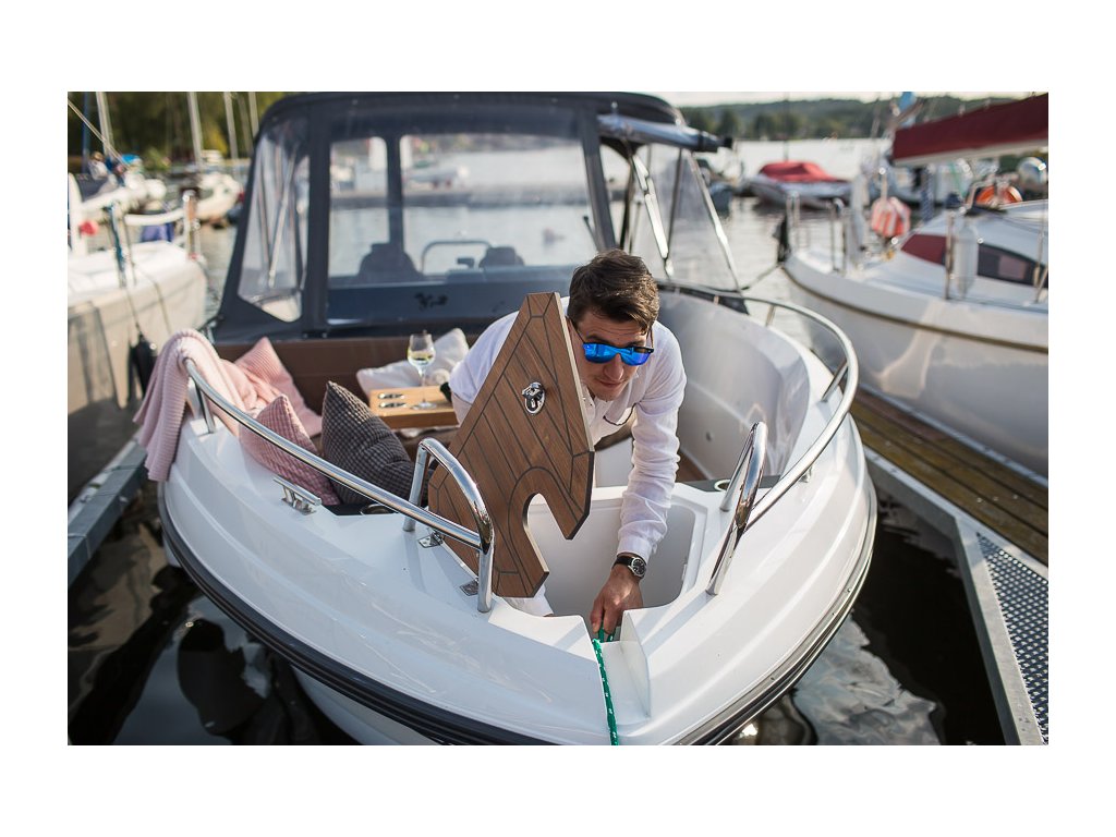 Bezpečnostní upozornění: Riziko pádu na mokré palubě. Muž přes palubu – riziko pádu do vody/ utonutí při nedodržování bezpečnostních opatření!