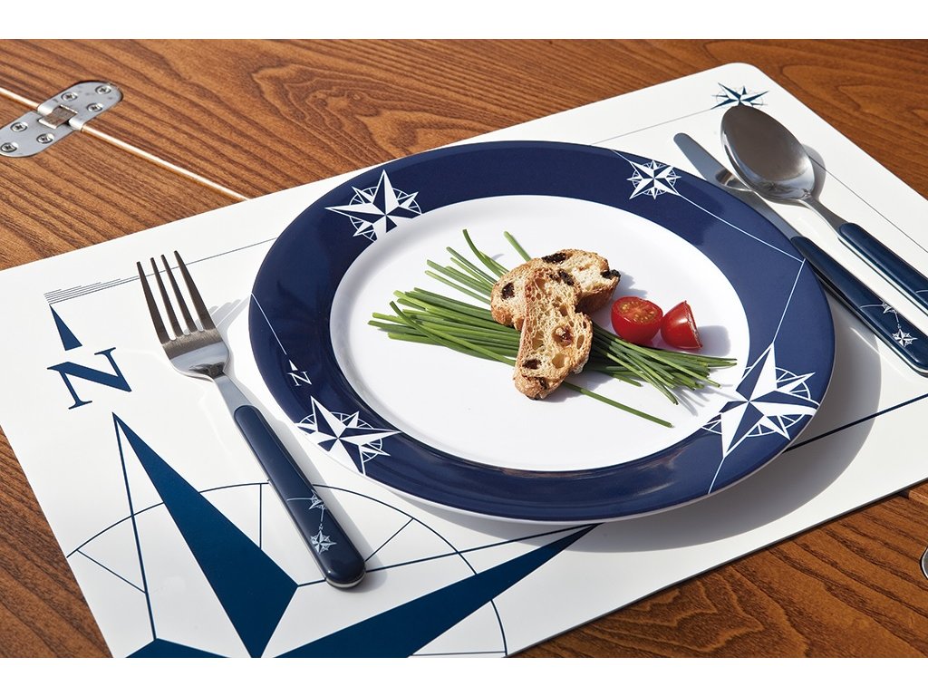 Nerozbitné melaminové nádobí v této sadě nádobí má zdobený okraj, stejně jako ostatní doplňky z kolekce, v námořnických modrých a bílých tónech s růžicí kompasu.