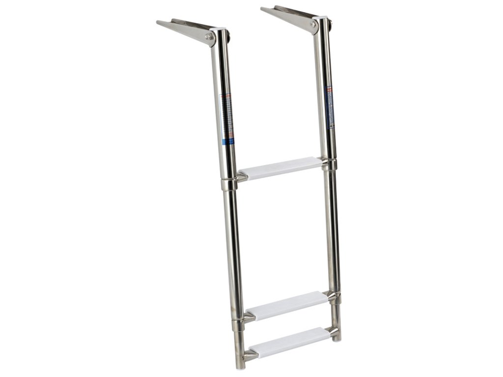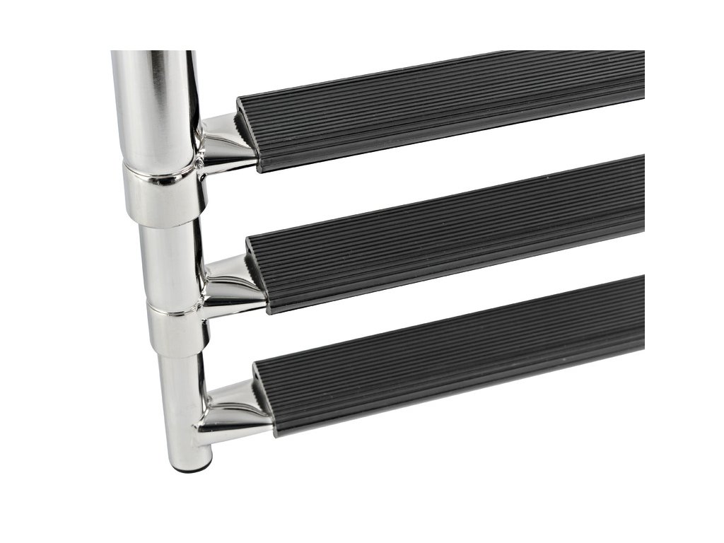 Třístupňové teleskopické schůdky do vody vyrobené ze zrcadlově leštěné nerezové oceli.